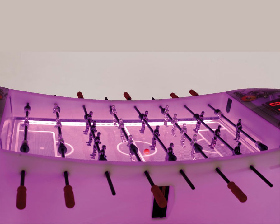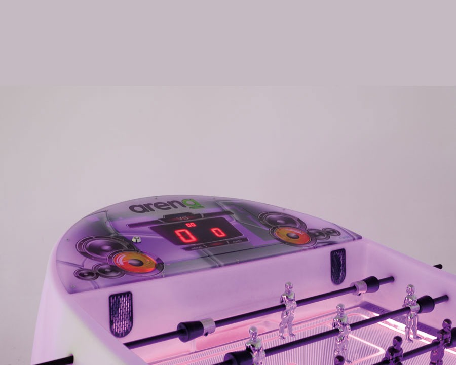 Un futbolín moderno y electrónico con iluminación interior de LED’s RGB inteligentes, controlados por una placa electrónica, igual que los marcadores a ambos lados del campo de juego. Está construido en un mueble sintético de una sola pieza y con cuatro niveladores para una colocación perfecta.